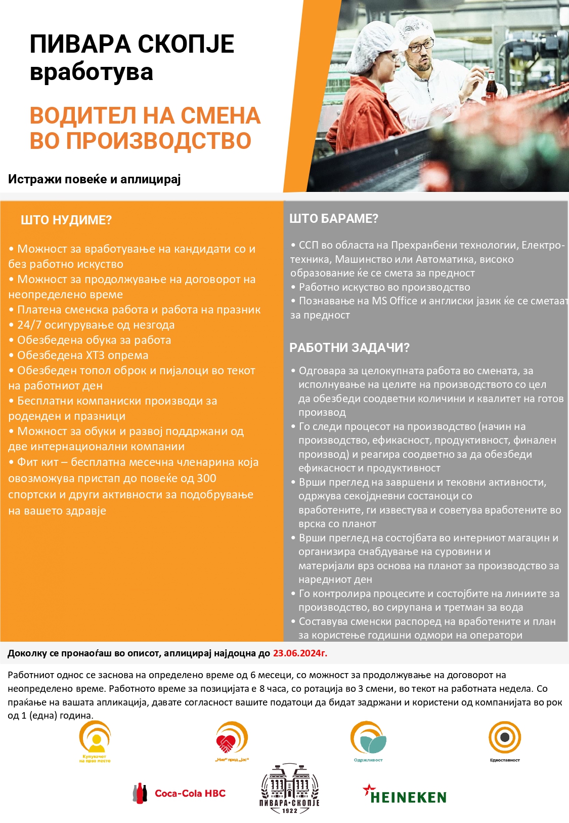 Пивара Скопје АД една од водечките компании во Северна Македонија со 100 години традиција, богато портфолио на производи и број еден позиција на пазарот ви нуди вистински предизвик. Пивара Скопје АД е дел од големите интернационални семејства на Coca-Cola HBC и Heineken.